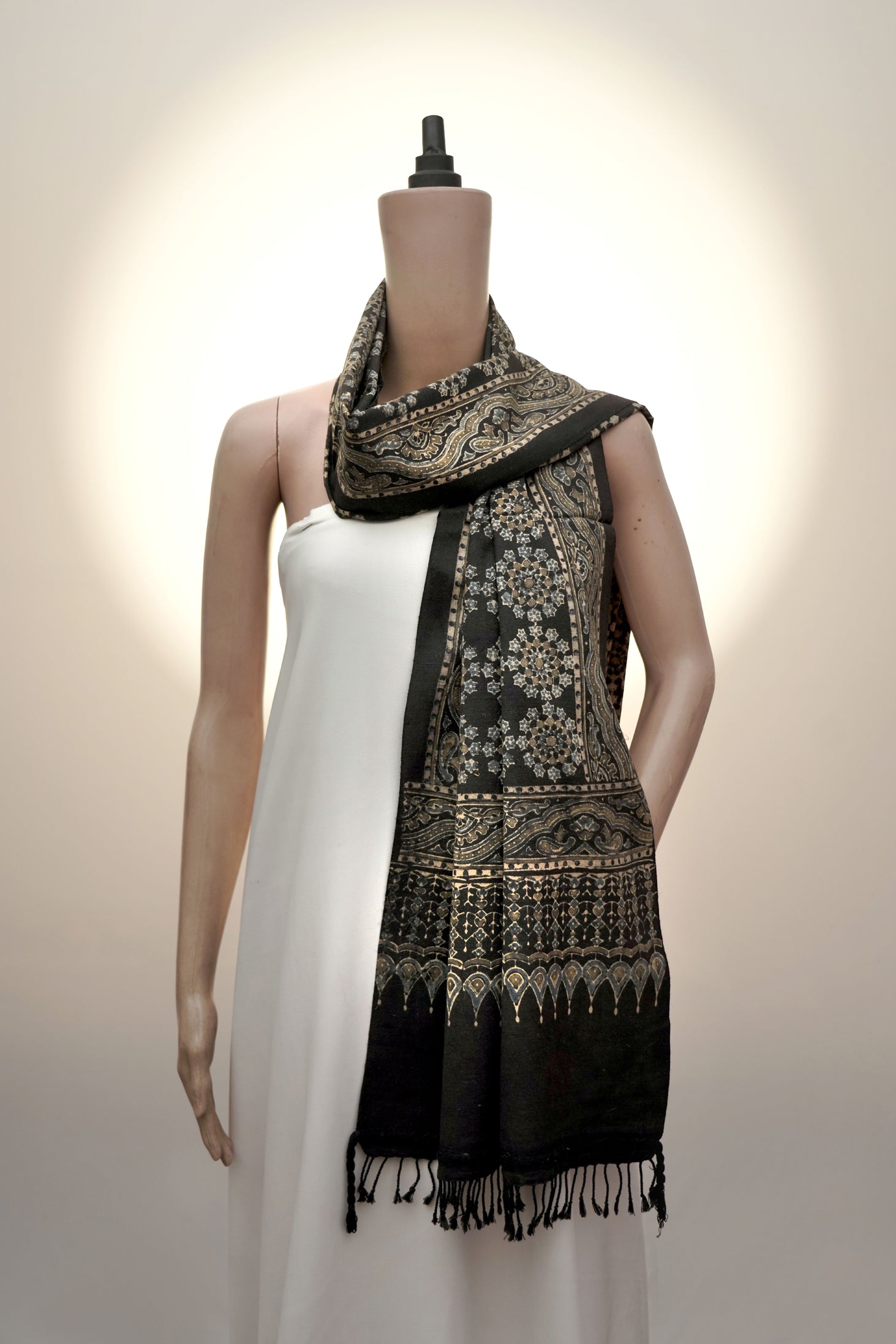 The Ajrak Shyam Mandala Stole is a masterpiece of quiet sophistication and heritage. Woven from handloom eri silk, it combines strength and softness, making it a versatile choice for both everyday use and special occasions. The design carries intricate mandala-inspired motifs, ornate borders, and delicate lattice details, printed in muted shades of beige, grey, and gold, creating a striking contrast against the deep black base.