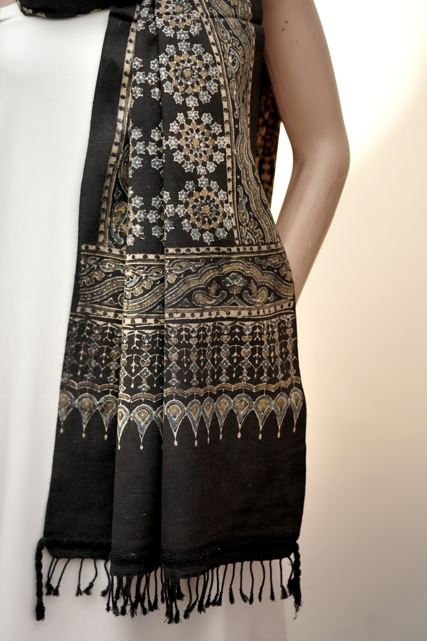 • Traditional Ajrak hand block printing, layered with fine detailing through natural dye resist techniques.