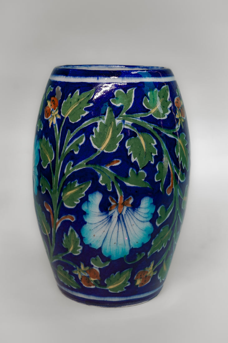 The artisan’s brush then brings the design to life, aqua petals edged in green, grounded by warm terracotta accents, all set against a deep royal blue. The glaze amplifies the colors, and a low-temperature firing locks in the sheen without dulling the piKgents. Perfect for holding pens, cutlery, or fresh sprigs of dried flowers, it is equally charming as a standalone accent in a study, vanity, or living room. With its mix of color and tradition, it is a subtle yet striking reminder of Rajasthan’s living craft heritage.