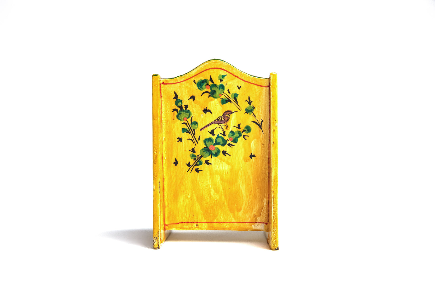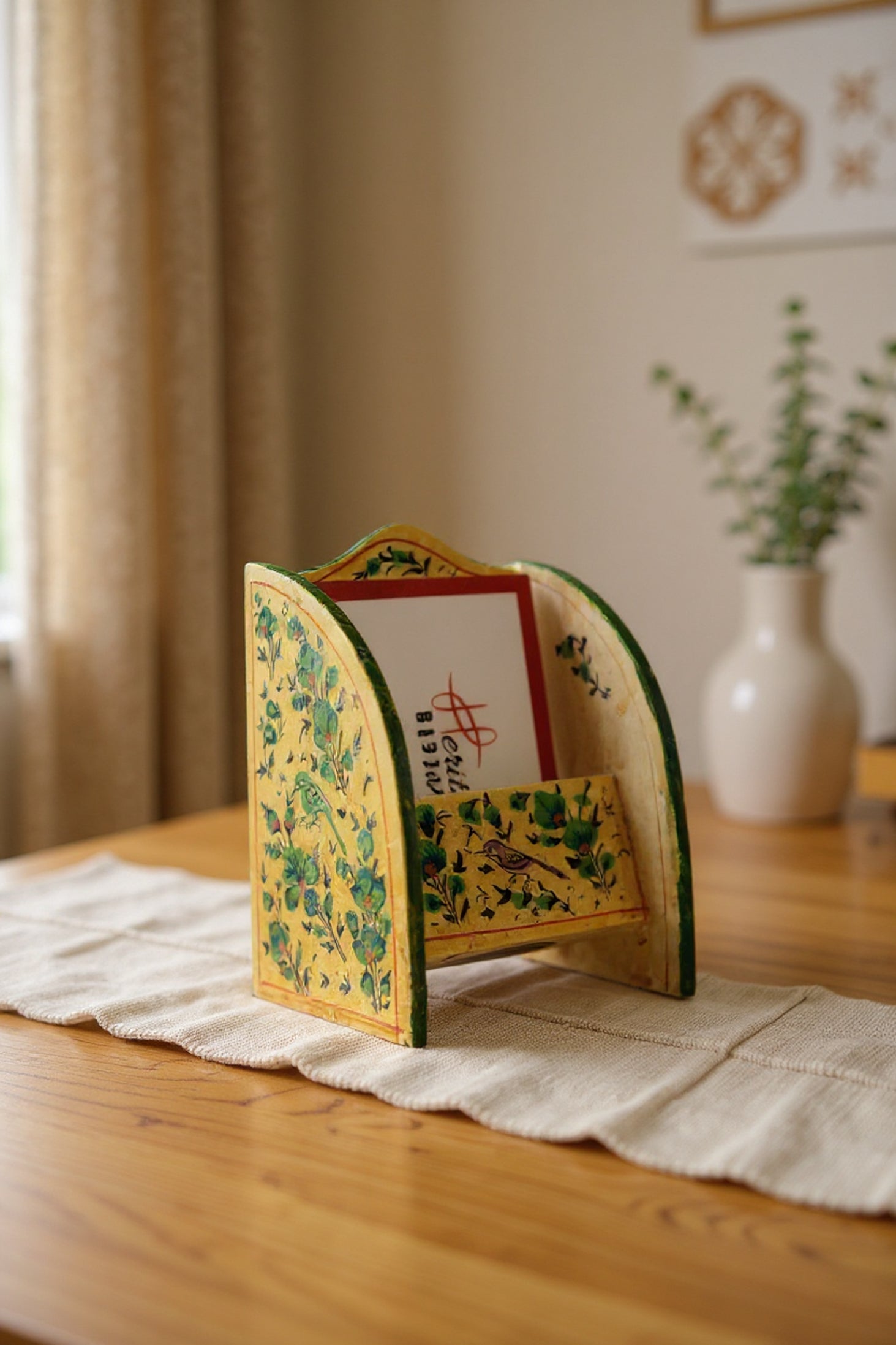 Imagine a quiet forest morning dew on leaves, chirps in the air, and sunlight kissing petals. Forest Whisper captures that moment through brush, pigment, and purpose. Hand-painted on papier-mâché with miniature florals and bird motifs, it brings serenity to any work desk.