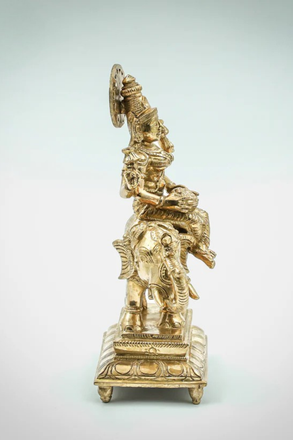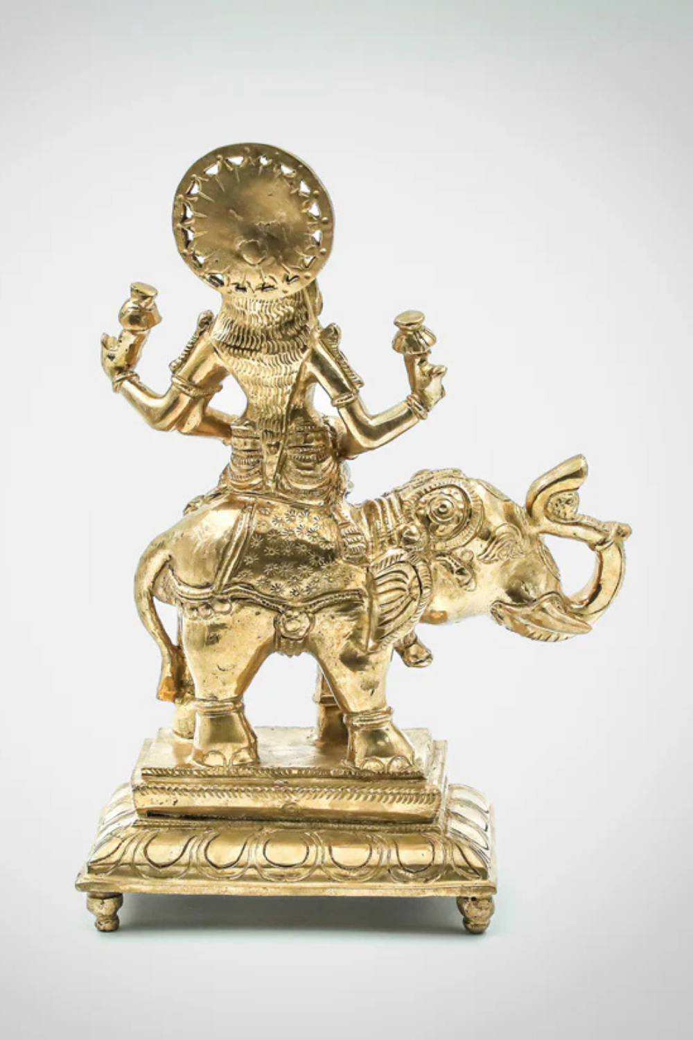 This 9-inch Panchdhatu sculpture represents Gaja Lakshmi, the goddess of fortune, wealth, and spiritual prosperity, seated majestically on an elephant. A celebrated form of Lakshmi, she is revered as the granter of abundance, often invoked during rituals for prosperity and auspicious beginnings.