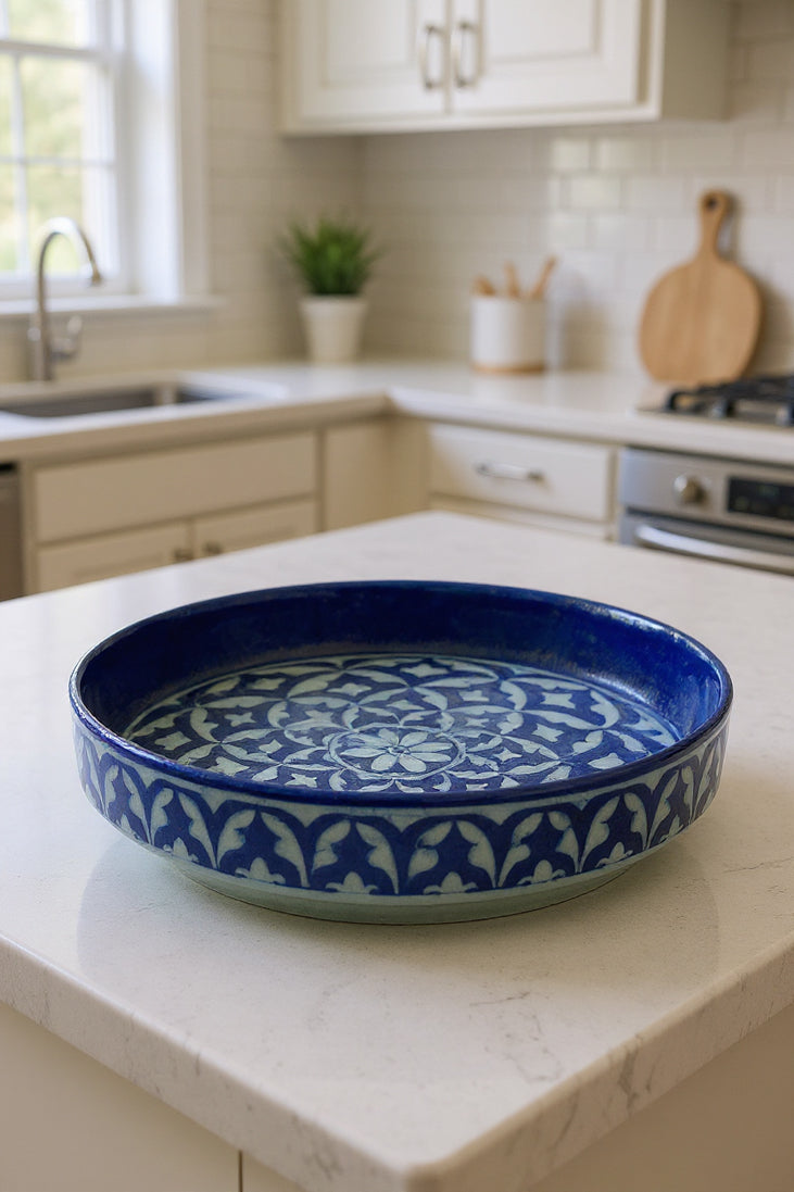 The Ivory Bloom Pasta Plate is where classic Mughal elegance meets everyday functionality. Its broad indigo canvas carries the grace of hand-painted ivory blooms, arranged in a medallion at the center and encircled by a rim of delicate vine motifs. The rich contrast between the deep blue glaze and soft ivory tones creates a sense of refined heritage, making this piece as fitting for your dining table as it is for your display shelves. Whether serving a hearty pasta, a fresh salad, or simply standing as an artful accent, this plate brings a story of craftsmanship and cultural beauty into your home.