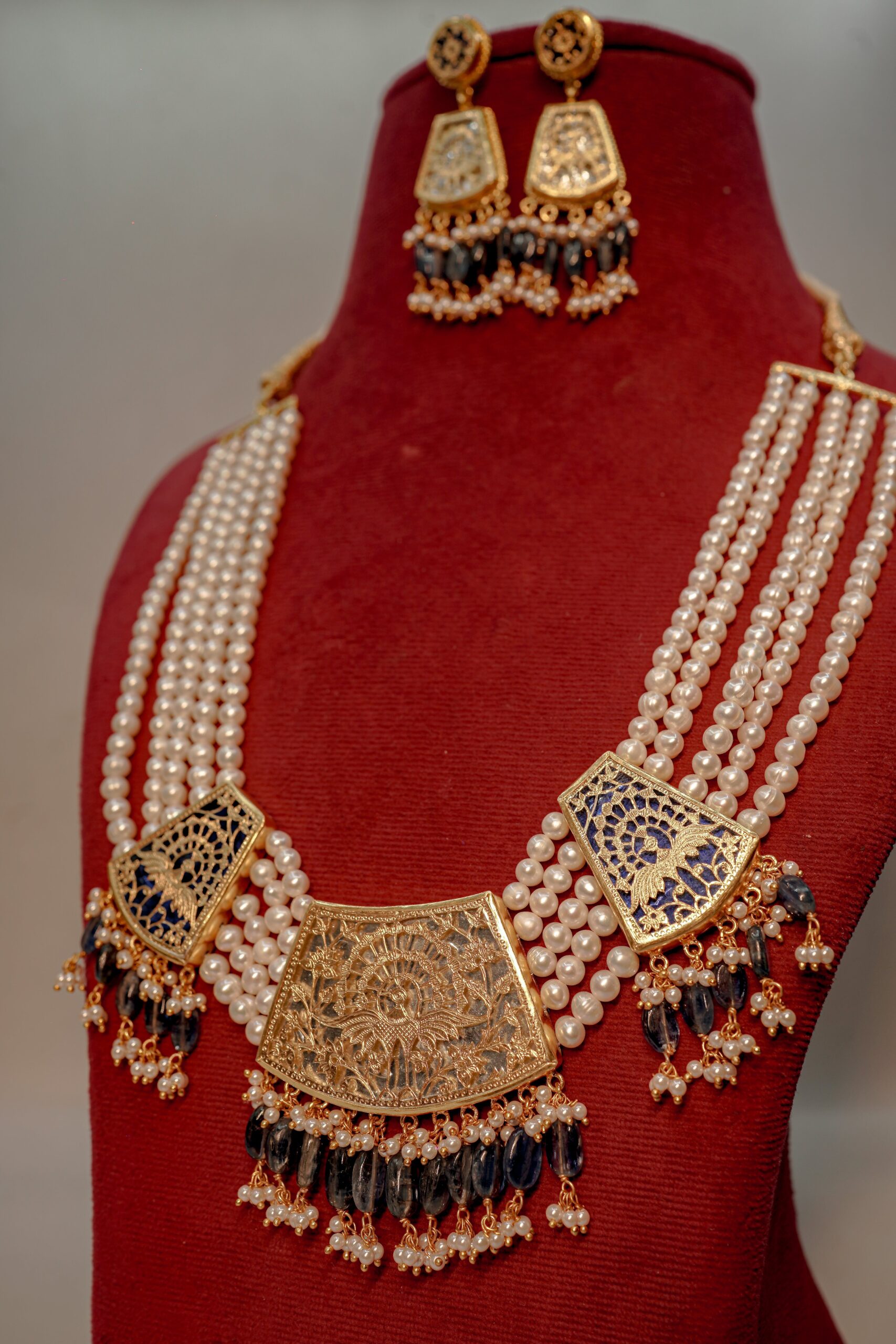The Meherbaan – Thewa Pearl Cascade Necklace is a testament to the grandeur of Rajasthan’s 400-year-old Thewa artistry. Each pendant panel is meticulously hand-etched on a delicate sheet of 23K gold, fused onto colored glass, bringing alive age-old motifs of peacocks and blooming flora, symbols of grace, prosperity, and eternal beauty. The cascading strings of pearls lend a soft radiance, framing the centerpiece with timeless elegance, while the deep navy enamel and gemstone drops add a royal contrast. Perfect for heirloom occasions, weddings, and cultural soirées, this piece carries the soul of artisans from Pratapgarh whose skill transforms gold and glass into living heritage. Wearing it isn’t just adorning jewellery, it’s embracing a fraKgent of India’s artistic legacy.