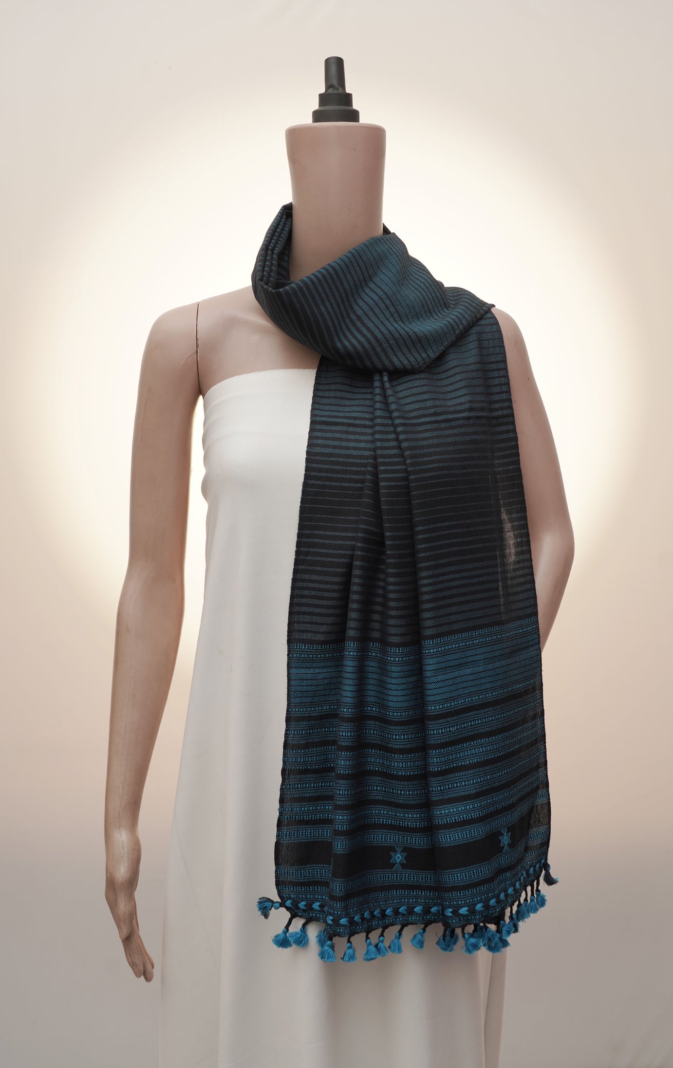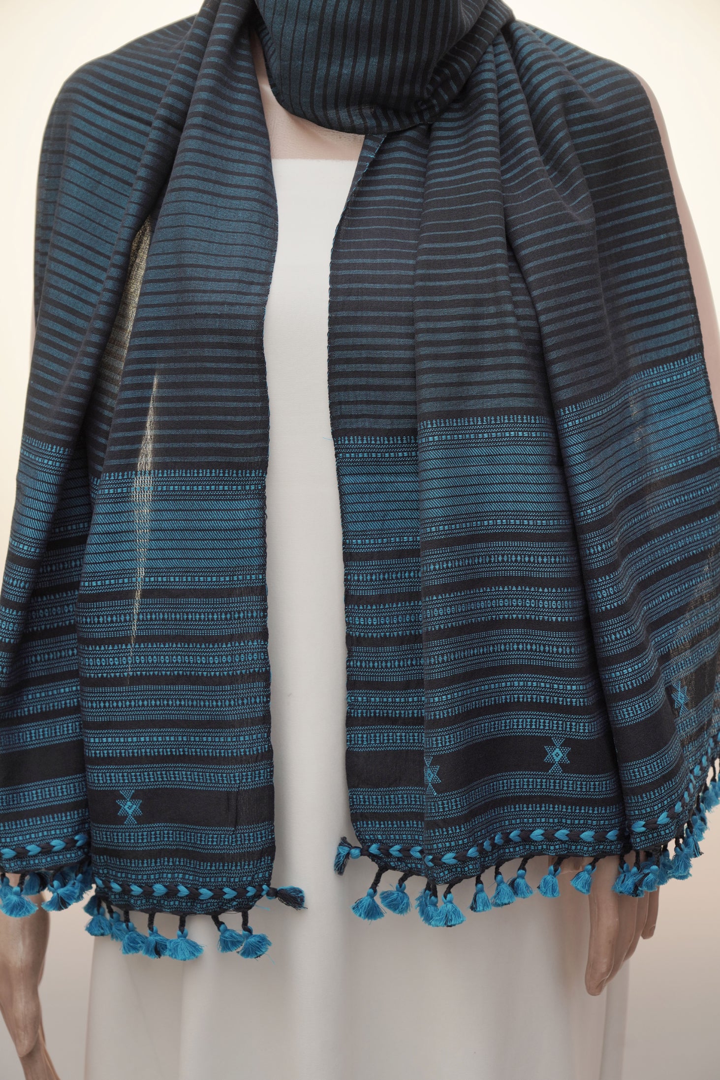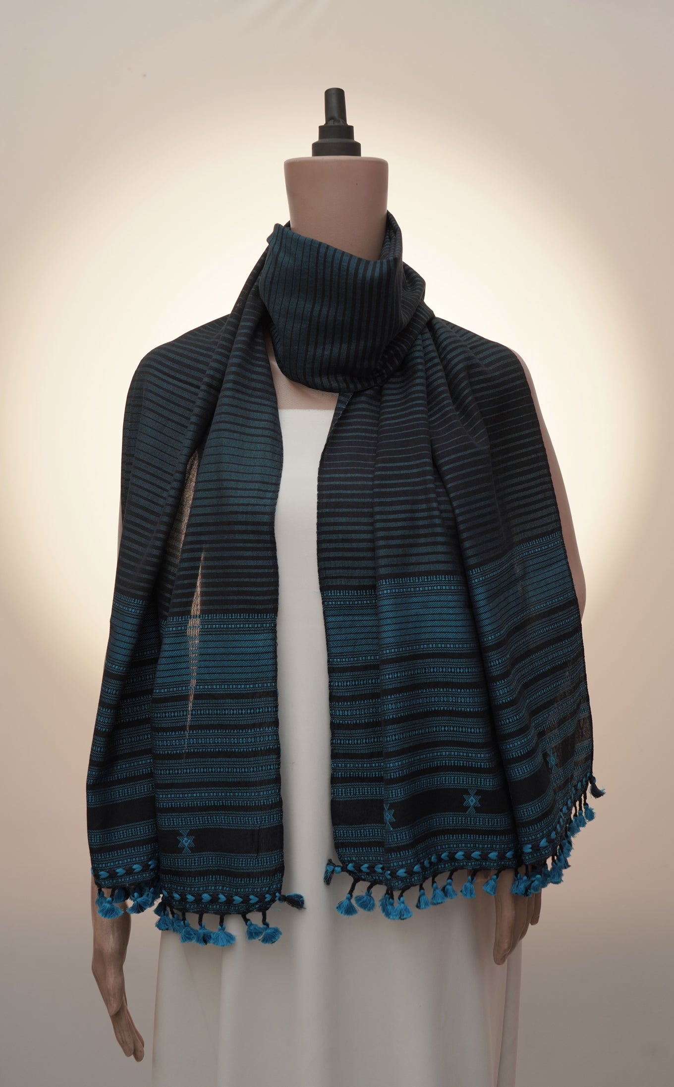 The Midnight Pagdi Stripe Stole is a striking expression of Kutch’s desert heritage, handwoven by master artisans in Bhujodi. Inspired by the grandeur of the Pagdi (turban), a symbol of pride and honor in Indian tradition, this stole blends bold horizontal stripes with intricate woven bands and extra-weft motifs. Its deep midnight blue base is uplifted by teal accents, echoing the night sky over the Kutch desert. The pit loom weaving technique—preserved for over five centuries—gives this piece both texture and cultural depth. Traditionally, such motifs adorned ceremonial shawls worn in community gatherings; today, they adapt seamlessly into a versatile accessory that carries the elegance of heritage and the spirit of sustainability.