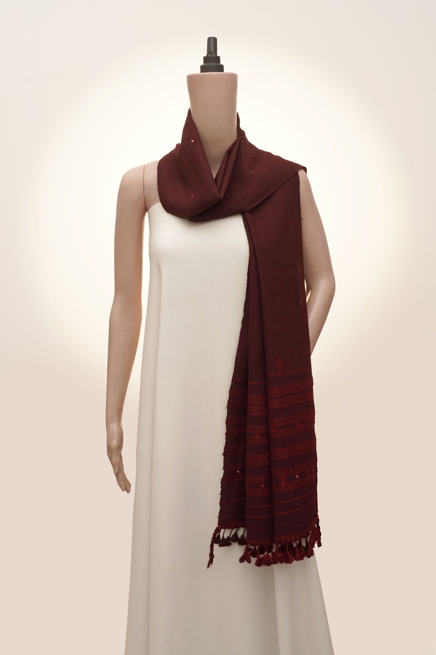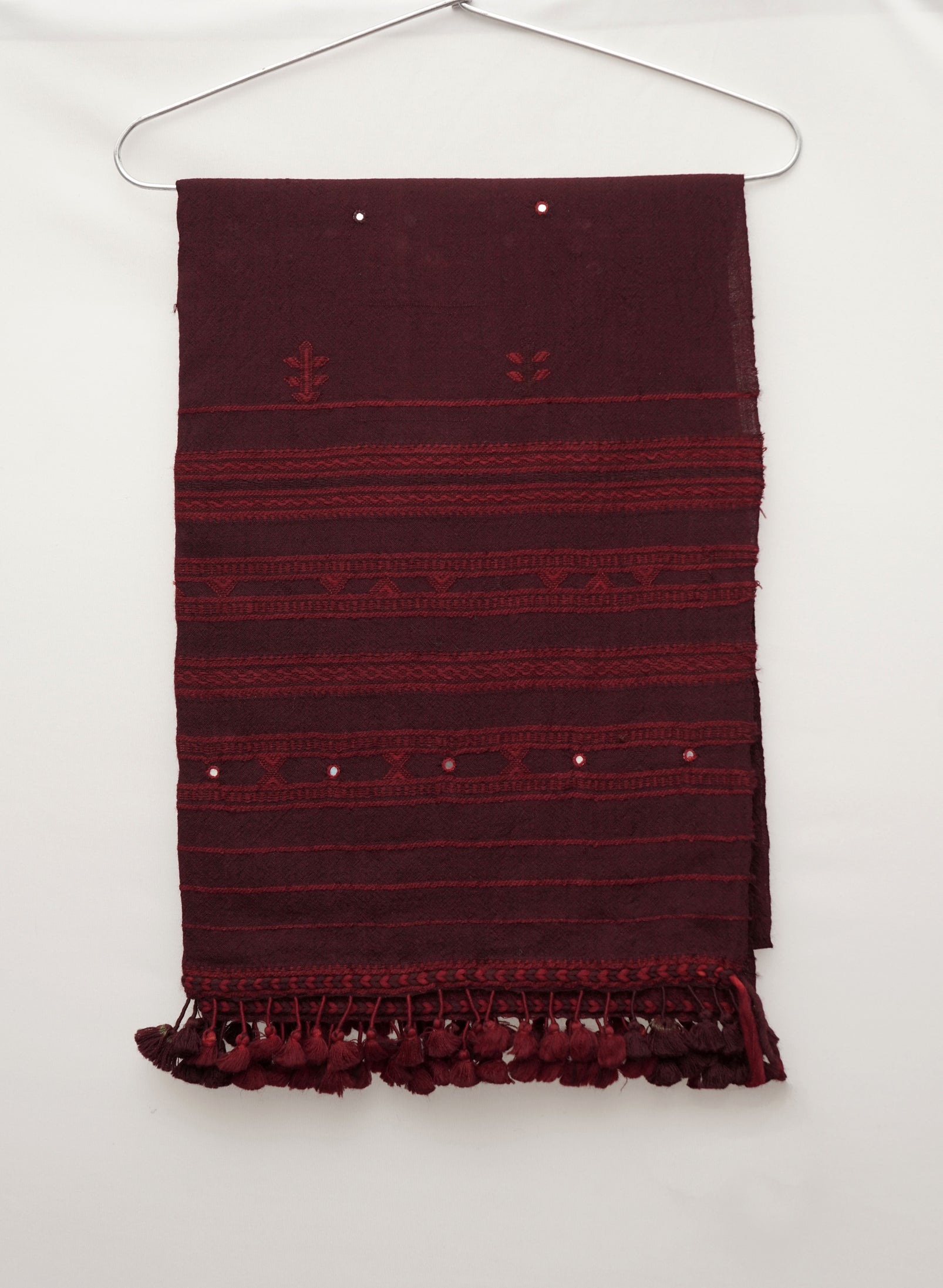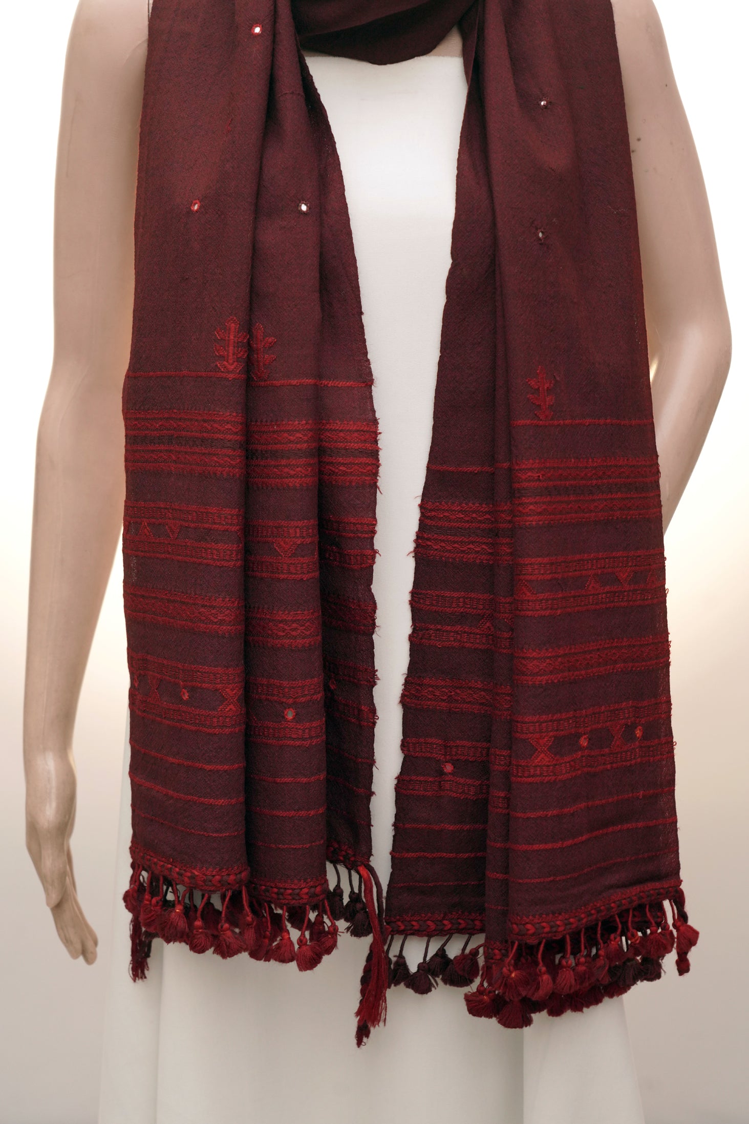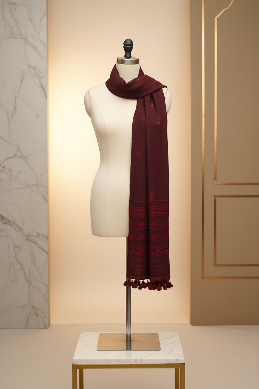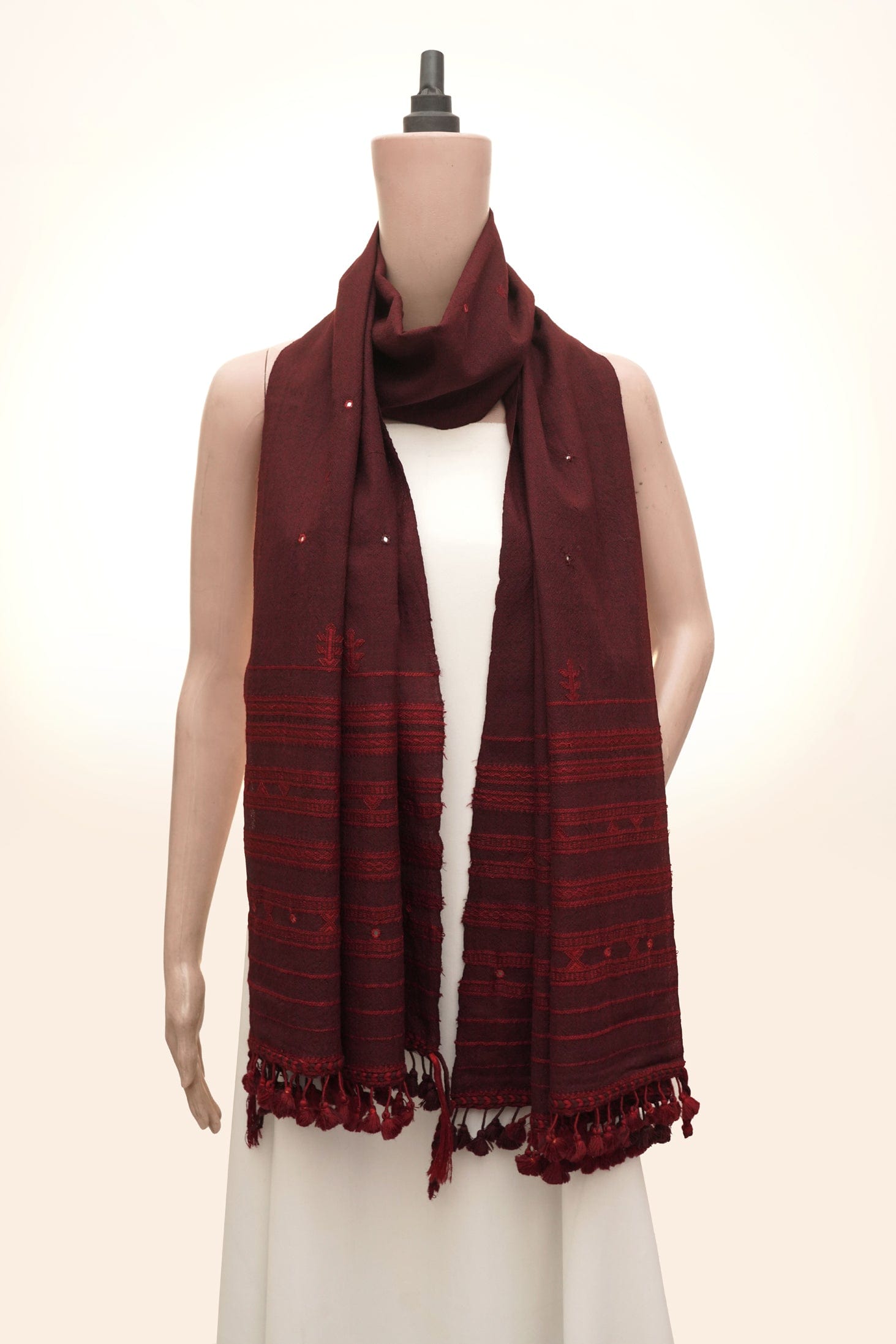 The Maroon Mirage Wool Mirrorwork Stole is a timeless blend of traditional craft and modern sophistication, woven by skilled hands in Kutch. Its deep maroon hue is adorned with delicate mirrorwork and extra-weft motifs, creating understated glamour and depth. The soft wool ensures comfort and versatility, while the handcrafted tassels add a playful yet refined flourish. This stole transforms every outfit with Kutch’s distinctive artistry, making it ideal for festive gatherings or elevating casual ensembles.