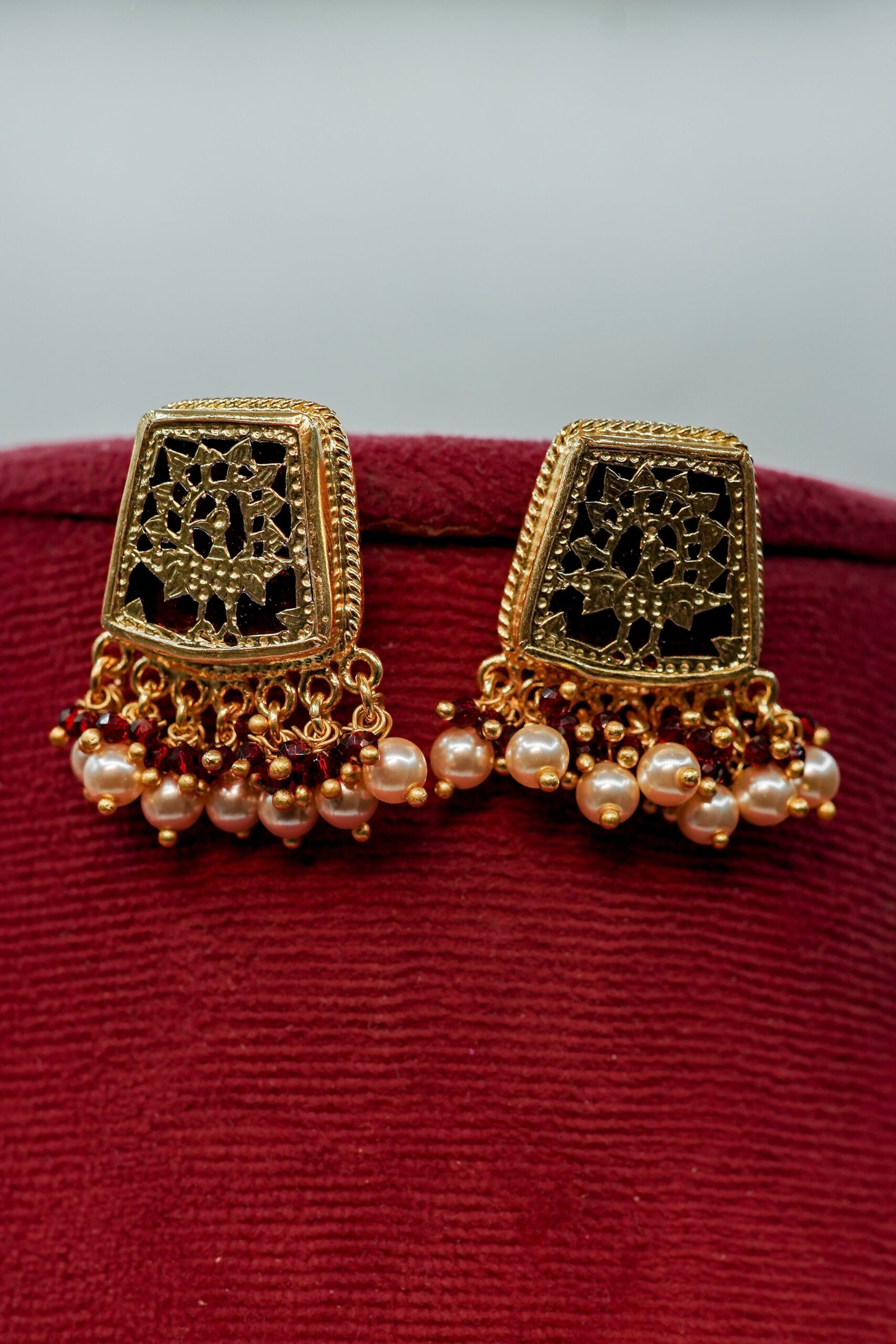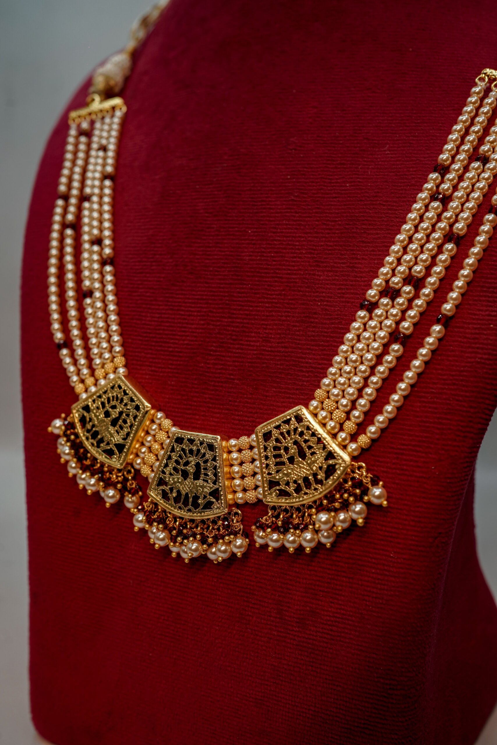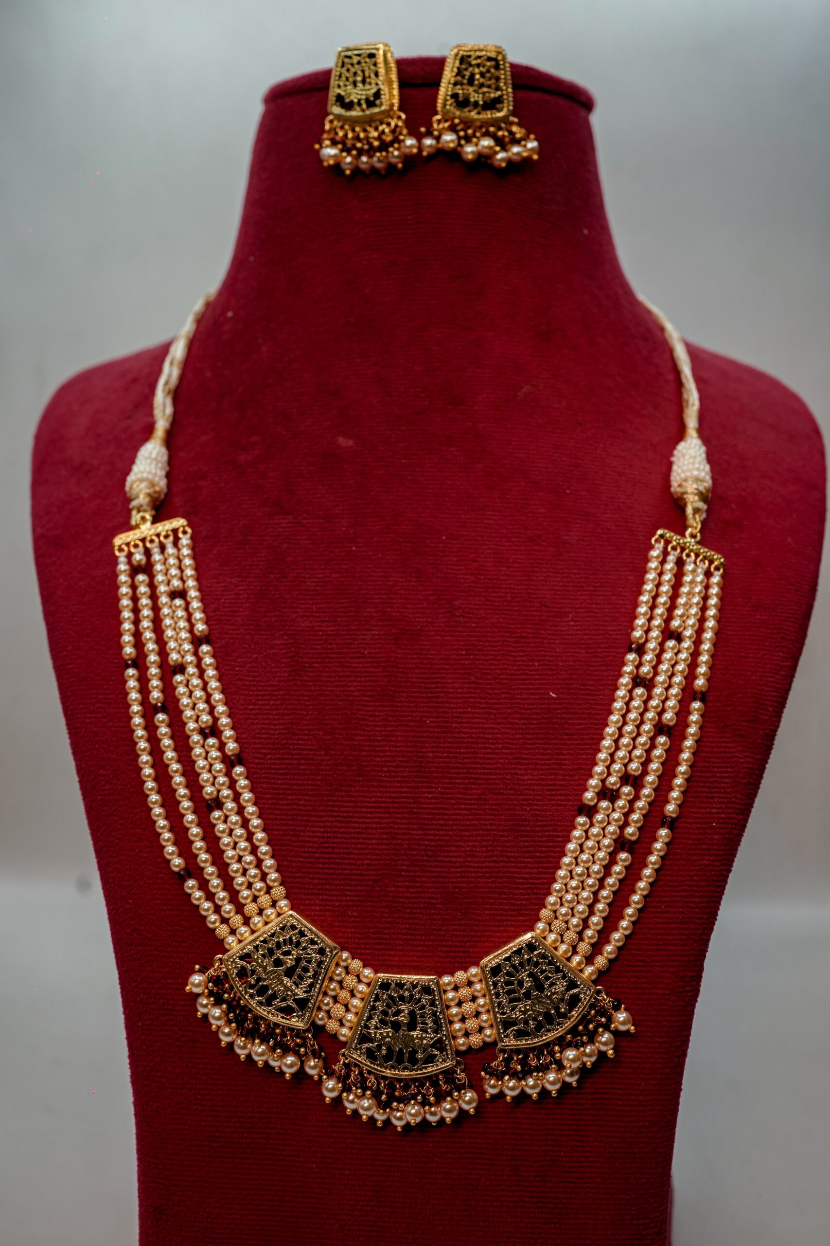 The necklace’s multi-strand design, composed of lustrous pearls and golden accents, frames the three ornate panels in perfect harmony. Matching earrings mirror the same motif and are adorned with pearl-bead tassels, adding movement and regal charm.