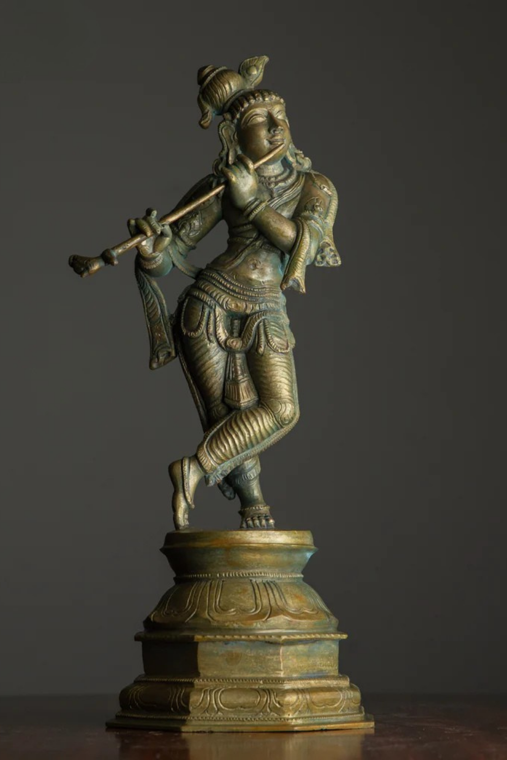 Krishna is shown in the iconic tribhanga stance, body gracefully bent in three curves as he raises the flute to his lips. His ornaments, anklets, and flowing drapery are rendered with minute detail, while the turban and serene smile reflect divine charm. The lotus-petal base anchors the figure in purity and transcendence, a reminder of Krishna’s cosmic presence.