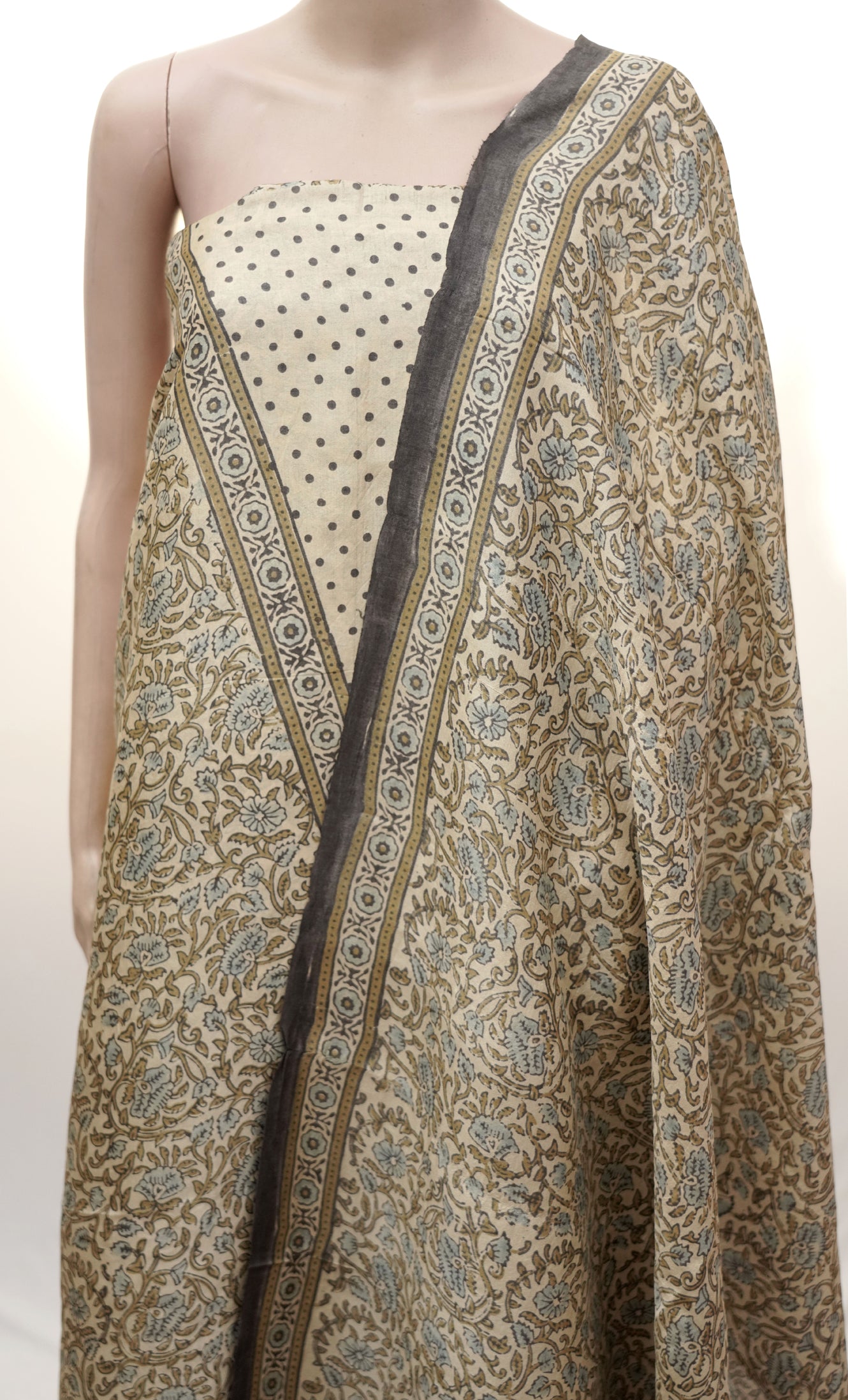 Natural dyes, derived from indigo, madder, and pomegranate, bring forth earthy tones of beige, sky blue, and muted green, harmoniously entwined in the floral vines that flow across the drape. The dotted pallu offers a striking yet subtle contrast, reflecting Ajrak’s eternal play of geometry and nature.